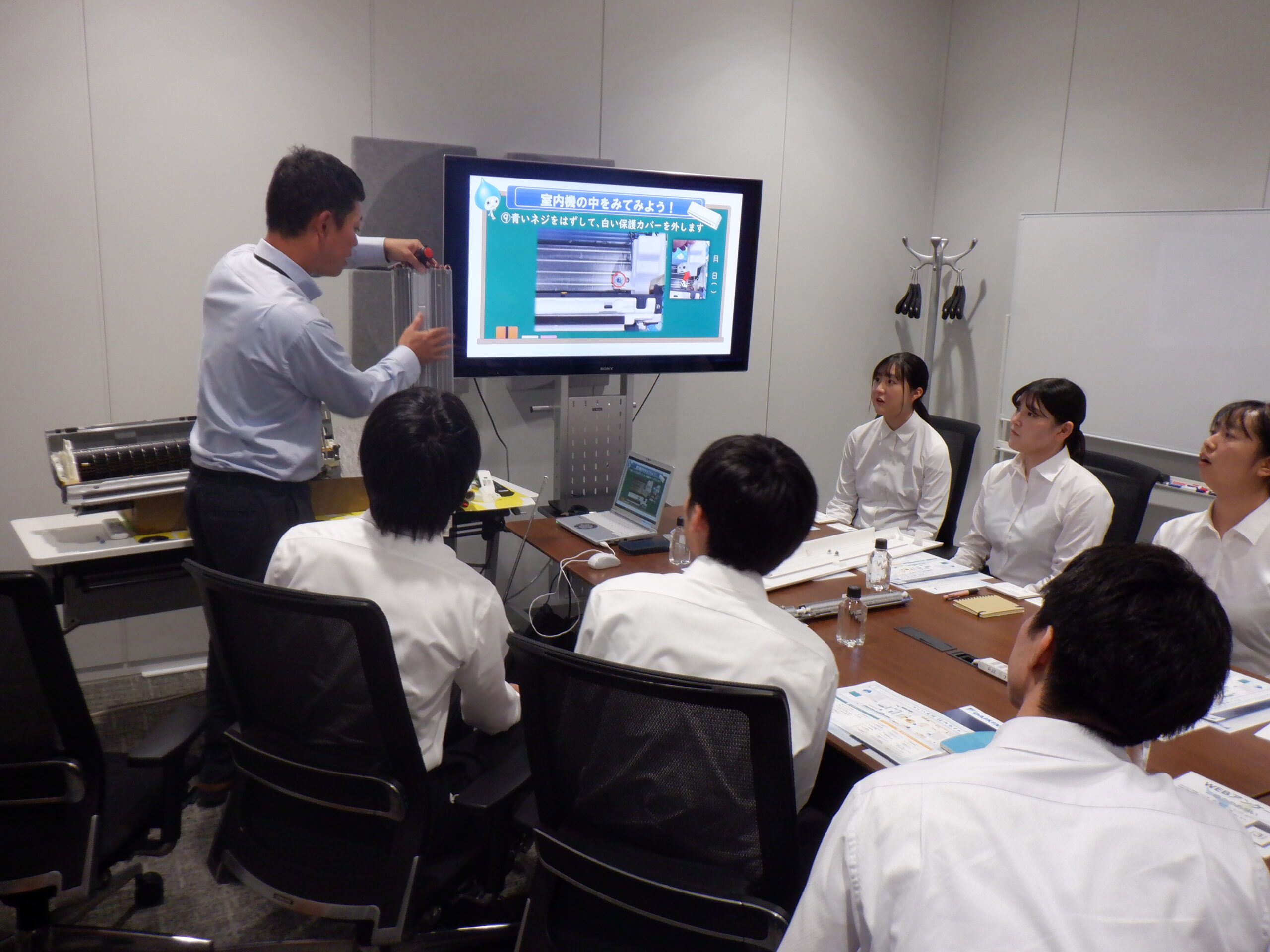 お取引先であるダイキンの展示場、フーハ大阪に行き、敬語や挨拶、名刺交換など学んだビジネスマナーの実践を行いました。エコ・プランが行う事業の根幹であるエアコンについて、エアコン分解や展示場見学を通して理解を深めることができました。