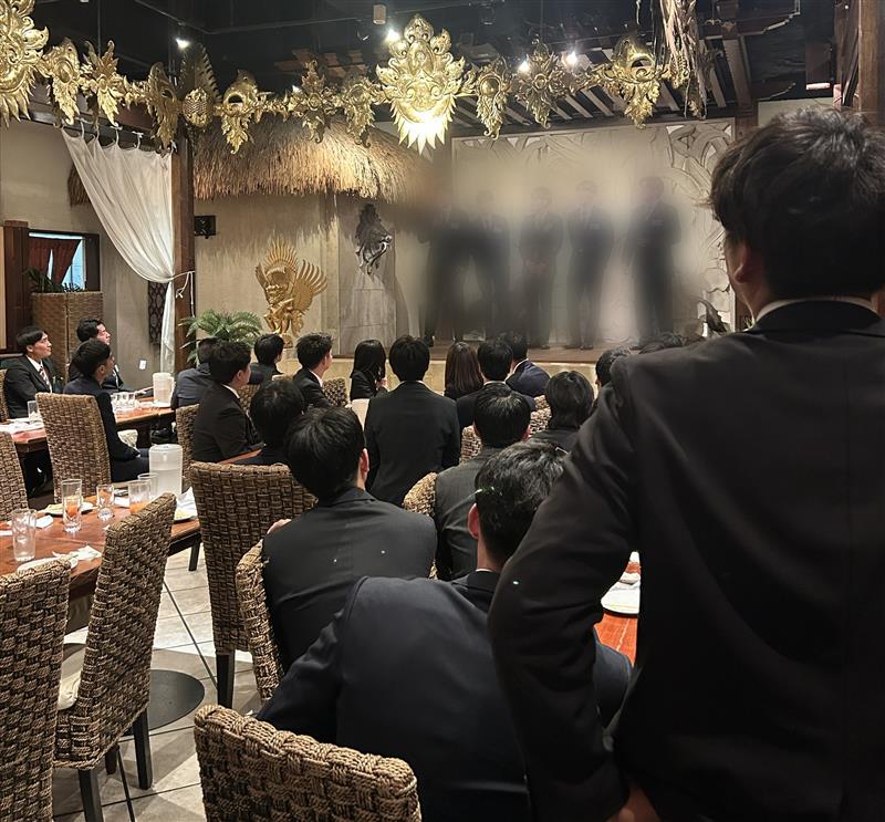 式後の懇親会では、リクルーターとして採用活動に関わる先輩社員や1年目の社員も参加しました。各グループに1年目の社員が付き、自己紹介やフリートークで雰囲気を温めていました🔥