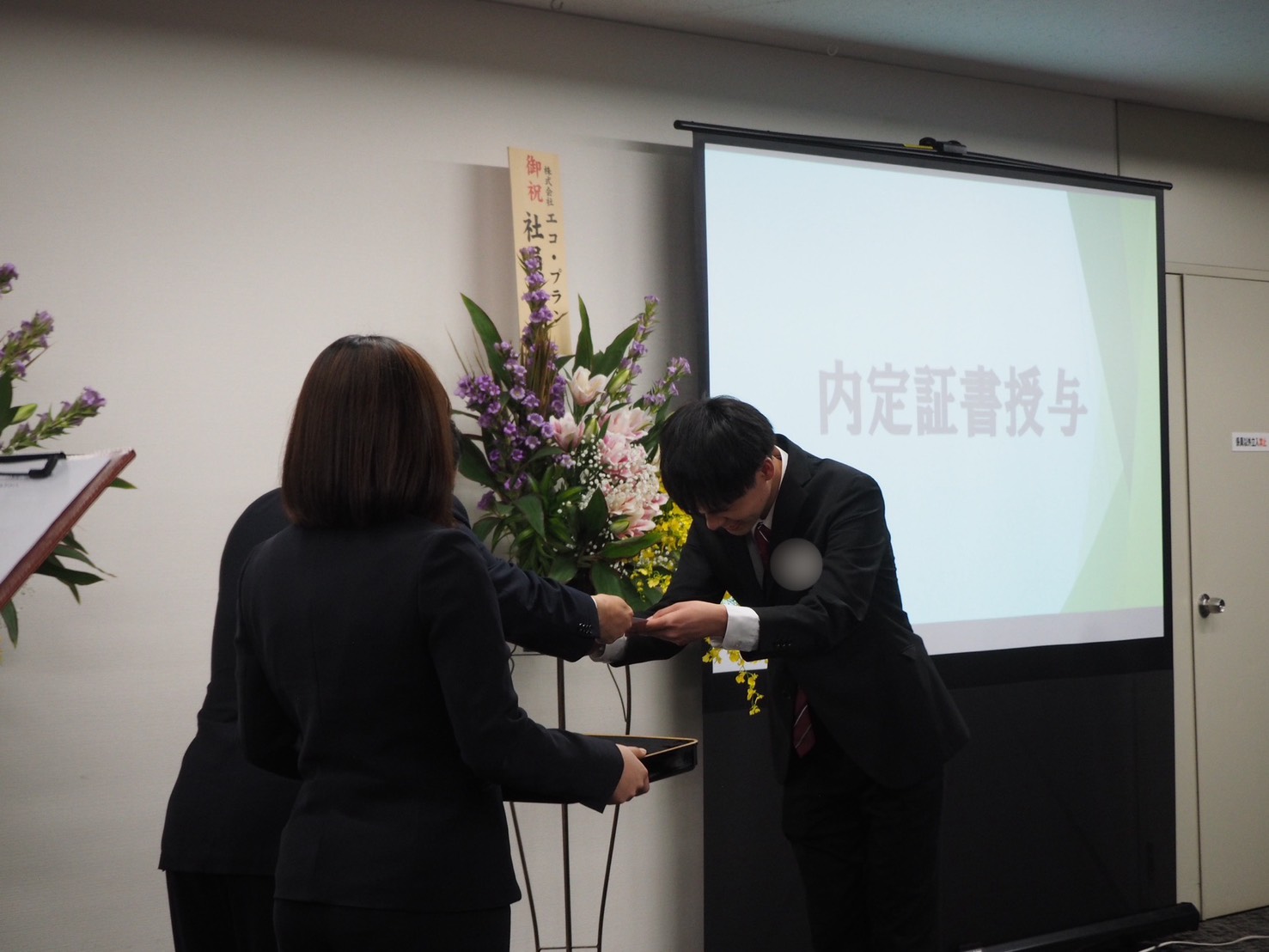 11月6日(木)西新宿の会場にて株式会社エコ・プラン『内定式』を執り行いました。今年は25名が参加しました。ぞろぞろ・・と、内定者が集まり始めたときはお互いによそよそしい雰囲気もありましたが、時おり同期と楽しそうに会話している様子が伺えたので「ホッ」としました。
