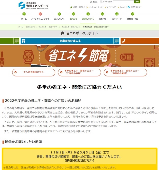 ※資源エネルギー庁 冬季の省エネ・節電にご協力ください