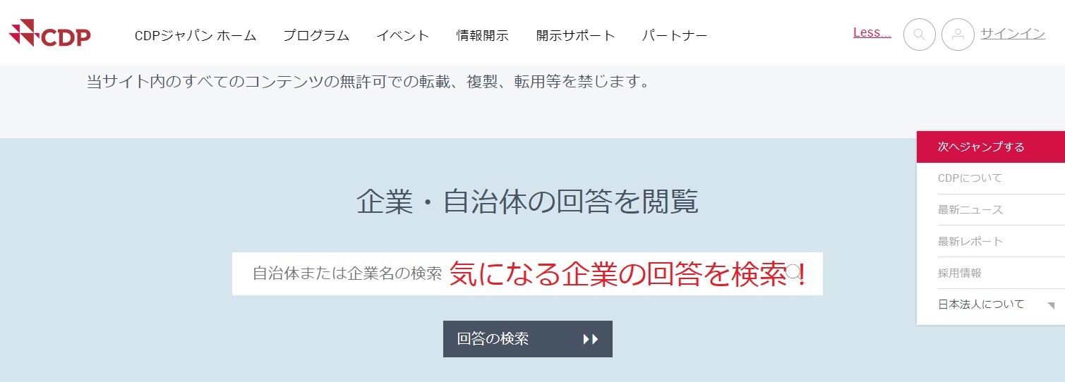 そんなときは、同業のCDP質問書回答を公開している企業について、CDPウェブサイトで検索し、複数社、見本として、どのような回答をしているのか、確認すると、イメージがつきます。