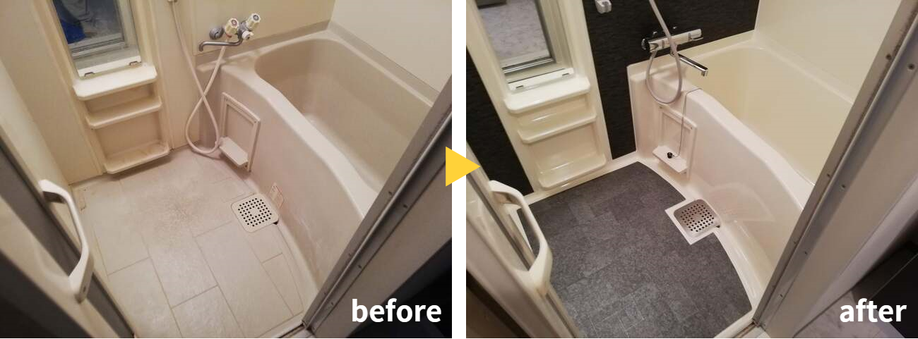 天井、壁3面と浴槽は再生塗装、壁1面は(※)フィルム貼り、床はシート貼りを提案いたしました。