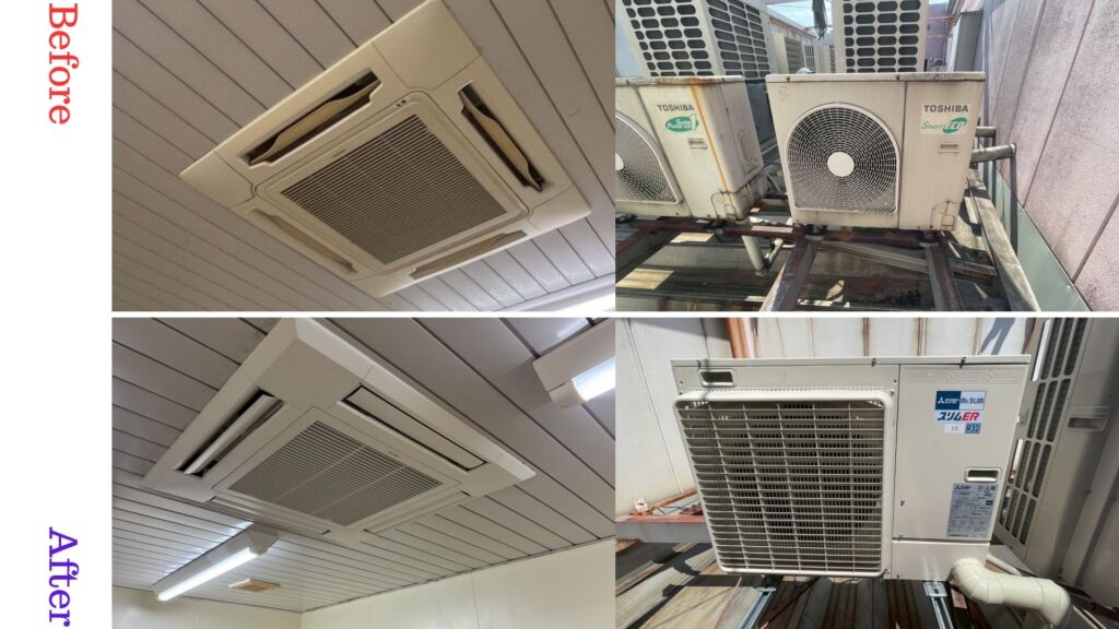 今回の店舗様では、長年ご使用いただいたエアコンが経年劣化により不具合が増えていたため、入替工事をご提案し、快諾いただき施工することになりました。