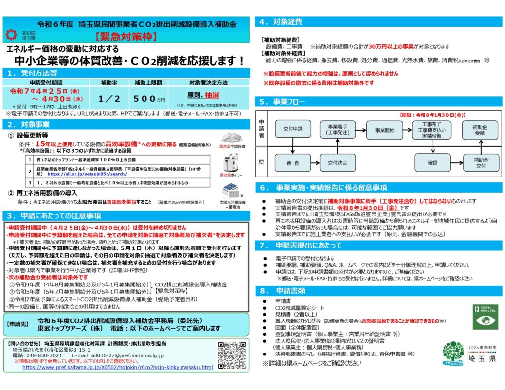 2025年3月4日、埼玉県の公式ホームページで『CO₂排出削減設備導入補助金【緊急対策枠】』の募集情報が公開されました。