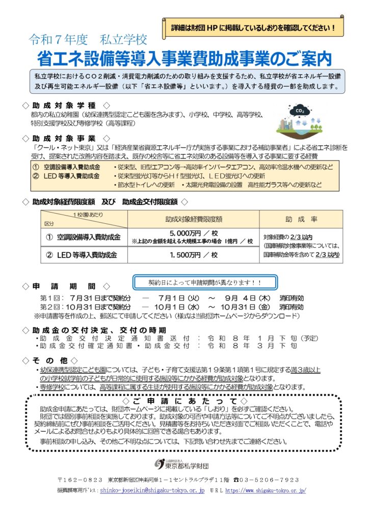 公益財団法人東京都私学財団のホームページで『私立学校省エネ設備等導入事業費助成事業』の助成事業開始のご案内が公開されました。