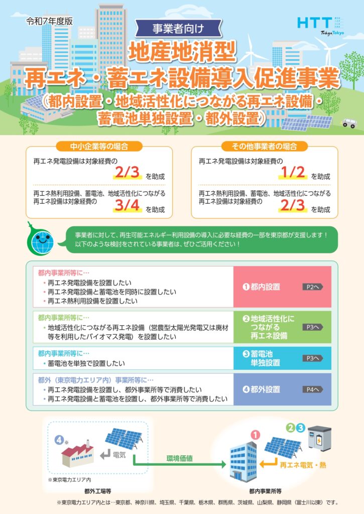 都内に地産地消型再生可能エネルギー発電等設備又は再生可能エネルギー熱利用設備、蓄電池単独設置を設置する事業者に対して、当該設備の設置に係る経費の一部が助成されます。